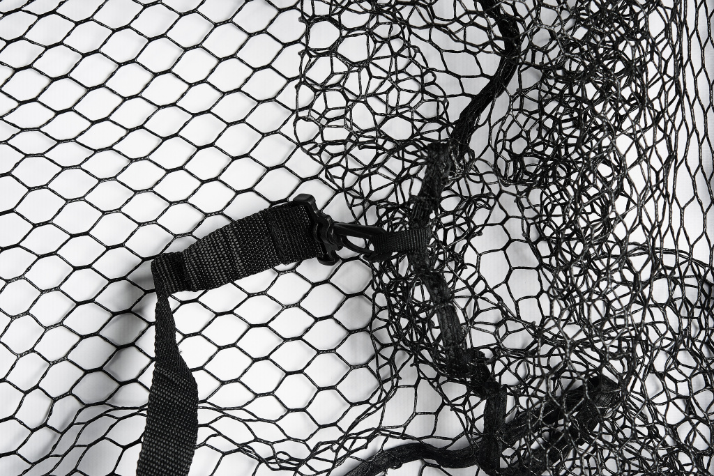 Резиновая сетка. Безопасна для рыбы, предотвращает запутывание крючков и быстро сохнет, облегчая уход за подсачеком.
